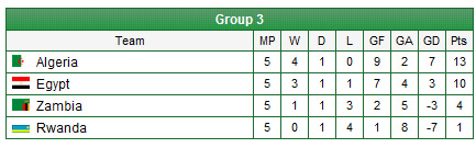 A l'issue de cette journée, l'Algérie reste en tête du groupe C avec un total de 13 points, devant respectivement l'Egypte (10 pts), la Zambie (4 pts) et le Rwanda (1 pt). La 6e et dernière journée prévue le 14 novembre prochain verra l'Algérie se déplacer au Caire pour y affronter l'Egypte, alors que le Rwanda accueillera à Kigali, la Zambie.