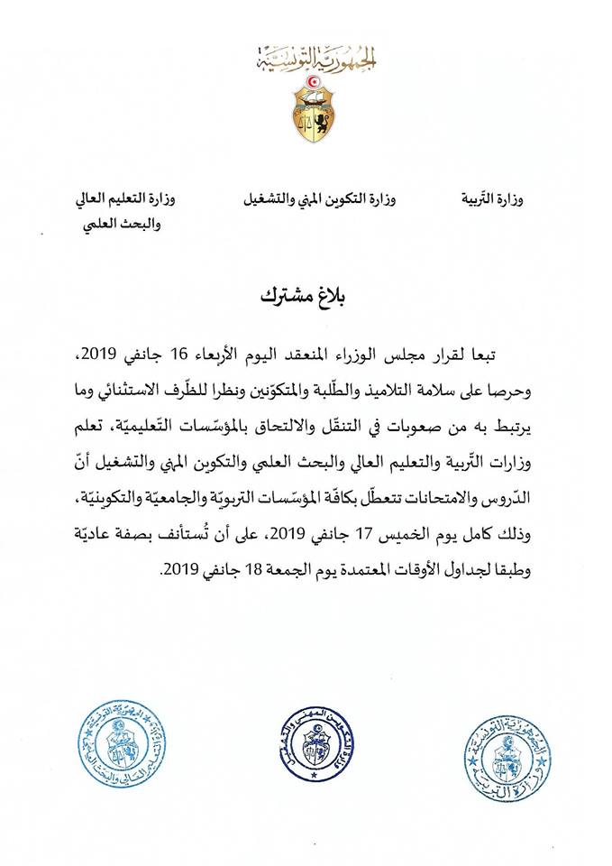 باب نات - تتعطل الدروس والامتحانات كامل يوم غد الخميس بكافة المؤسسات التربوية والجامعية والتكوينية، على ان تستأنف يوم الجمعة 18 جانفي بصفة عادية وطبقا لجداول الأوقات المعتمدة، وفق ما أعلنت عنه مساء اليوم الاربعاء وزارات التربية والتعليم العالي والبحث العلمي والتكوين المهني والتشغيل في بلاغ مشترك.
