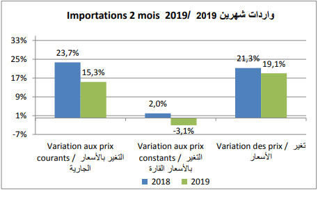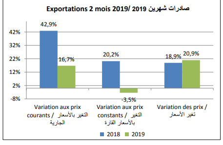 وارتفعت المبادلات التجارية لتونس مع الخارج دون احتساب مواد الطاقة على مستوى الصادرات خلال شهري جانفي وفيفري 2019 بنسبة 21,2 بالمائة و بنسبة 18,2 بالمائة على مستوى الواردات علما وان اسعار مواد الطاقة ارتفعت على مستوى الصادرات بنسبة 17,4 بالمائة وعلى مستوى الواردات بنسبة 25,5 بالمائة.
