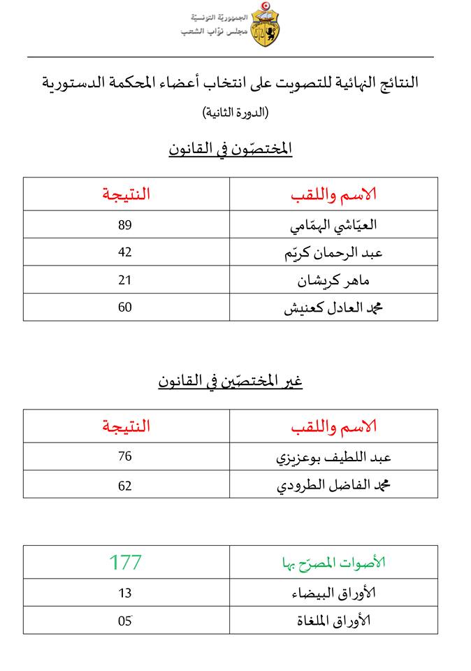 وبلغ عدد الأصوات المُصرّح بها 177 صوتا، فيما بلغ عدد الأوراق البيضاء 12 وعدد الأوراق الملغاة ورقتان اثنتان، وفق ما ذكره عبد الفتاح مورو الذي قال إن هذه النتائج ومحضر الفرز الذي أعدته لجنة إحصاء الأصوات سترفع لاحقا إلى مكتب المجلس.