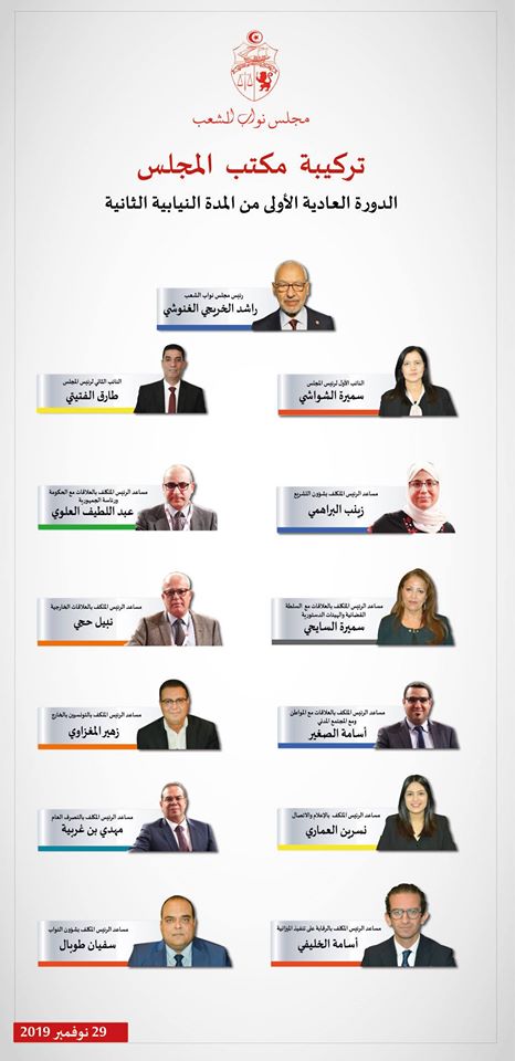 باب نات - أعلن راشد الغنوشي رئيس مجلس نواب الشعب خلال الجلسة العامة المنعقدة صباح اليوم الجمعة 29 نوفمبر 2019 عن توزيع المهام والمسؤوليات بمكتب المجلس على النحو التالي :