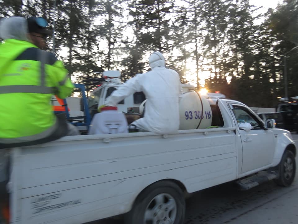 وقد جنّدت آليات البلديات واعوانها بالموازاة مع حملة المدرعات، لتعقيم الانهج داخل الاحياء السكنية بنفس البلديات وذلك في جهود مشتركة لتعميم عملية التعقيم على كافة الاحياء في خطوات استباقية إضافية قد تحدّ من انتشار عدوى فيروس كورونا ، بعد عمليات تعقيم متكرّرة كانت قد باشرتها مختلف بلديات الجهة منذ بداية انتشار الوباء وبامكانياتها الخاصة وبمعاضدة متطوّعين وممثلي مجتمع مدني من كشافة وهلال احمر.