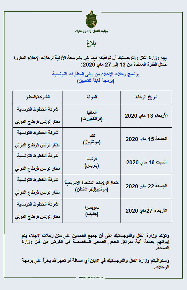 وأك{ت وزارة النقل في بلاغها أن جميع القادمين على متن رحلات الإجلاء يتمّ إيوائهم بصفة آليّة بمراكز الحجر الصحّي المخصّصة للغرض من قبل وزارة الصحّة.
