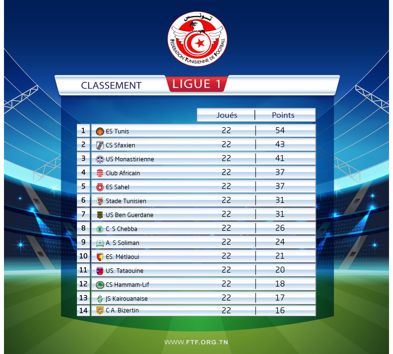 وعزز فريق الاحمر والاصفر موقعه في صدارة الترتيب بفارق 11 نقطة كاملة عن النادي الصفاقسي صاحب المركز الثاني فيما صعد النادي الافريقي الى المركز الرابع رفقة النجم الساحلي برصيد 37 نقطة لكل منهما.