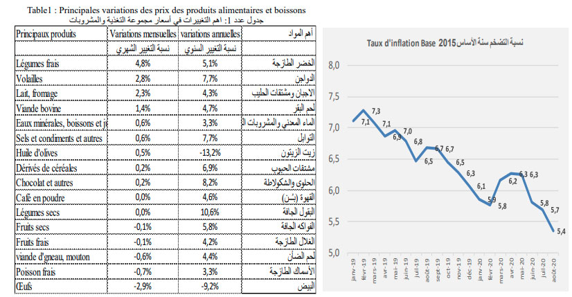 ويعود ارتفاع مؤشر الاسعار الى صعود اسعار التبغ بنسبة 5،9 بالمائة والتغذية والمشروبات (1،1 بالمائة) مقابل تراجع اسعار الملابس والاحذية بنسبة 4،7 بالمائة مع بداية موسم التخفيضات الصيفية وسجل مؤشر مجموعة التغذية والمشروبات زيادة بنسبة 1،1 بالمائة مقارنة بشهر جويلية 2020 وذلك بفعل ارتفاع اسعار الحليب الطازج بنسبة 7،8 بالمائة والخضر (4،8 بالمائة) والدواجن (2،3 بالمائة) في حين وتراجعت اسعار البيض (2،9 بالمائة) والاسماك الطازجة بنسبة 0،7 بالمائة وشهد مؤشر مجموعة المشروبات الكحولية والتبغ ارتفاعا بنسبة 5،9 بالمائة مدفوعا بارتفاع اسعار التبغ (6،3 بالمائة) في حين تراجعت مجموعة الملابس والاحذية (4،7 بالمائة) مع بداية موسم تخفيضات صيف 2020.