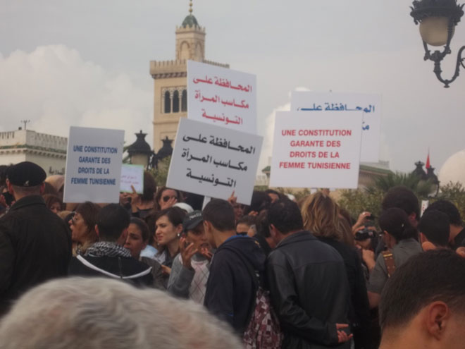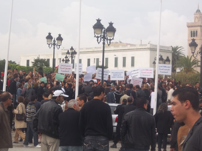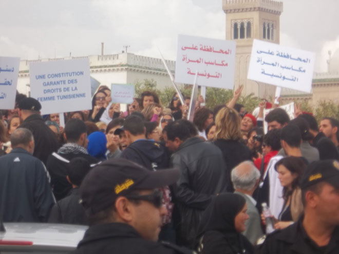 باب نات - تجمعت منذ منتصف النهار حوالي 250 امرأة في ساحة الحكومة بالقصبة مطالبات الحكومتين المؤقتة الحالية و القادمة بتقديم ضمانات للمرأة التونسية بالحفاظ على حقوق المرأة التونسية و تضمين ذلك في الدستور التونسي الجديد ،و قد رفعت النساء عديد الشعارات في هذه الوقفة الأولى من نوعها لعل أبرزها "مسلمات مسلمات مع ضمان الحريات" مرددات النشيد الوطني في أكثر من مناسبة.و قد أثارت هذه الحركة ردود فعل متباينة بين الرفض و القبول و التساؤل عن أسباب هذه البادرة و الحال أنه لم يتم التصريح علنا و مباشرة و لا بقانون معين عن نية التراجع في مكتسبات المرأة التونسية.
