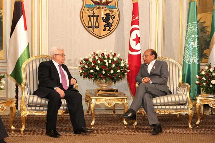 باب نات - تمحور اللقاء الذي جمع مساء يوم السبت رئيس الجمهورية السيد محمد المنصف المرزوقي بالرئيس الفلسطيني السيد محمود عباس والوفد المرافق له على متابعة تطورات القضية الفلسطينية. حيث أكد الجانب الفلسطيني أنّ تونس بإمكانها القيام بدور هام دبلوماسيا على الصعيد العالمي، نظرا لما باتت تتمتع به من مكانة معنوية بعد ثورة الحرية والكرامة ، في المطالبة بإطلاق سراح ألاف الأسرى الفلسطينيين من السجون الإسرائيلية وإنهاء معاناتهم الإنسانية. كما تطرق اللقاء لمستجدات ملف المصالحة بين حركة فتح وحماس وضرورة تفعيل اتفاق الدوحة لإنهاء حالة الانقسام الفلسطيني التي لاتخدم نضال الشعب وتؤبد الأوضاع الحالية . وأكد الرئيس محمود عباس أنّ القضية الفلسطينية هي قضية كلّ التونسيين معتبرا أنّ دور تونس كان ولازال رائدا في دعم نضالات شعبه. كما عبر عن شكره لمنح سفارة بلده قطعة أرض لبناء مقر جديد.