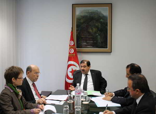 باب نات - اجتمع السيد رياض بالطيب وزير الاستثمار والتعاون الدولي صباح اليوم بمقر الوزارة بالسيد Walter HIRCHE الوزير السابق الألماني للبيئة ومنسق برنامج فرق الانتقال « Les équipes de transition » الذي يؤدي زيارة عمل إلى تونس حاليا مرفوقا بعدد من االخبراء الألمان في مجالات، المؤسسات الصغرى والمتوسطة، والسياسات التجارية والصفقات العمومية والسياحة.