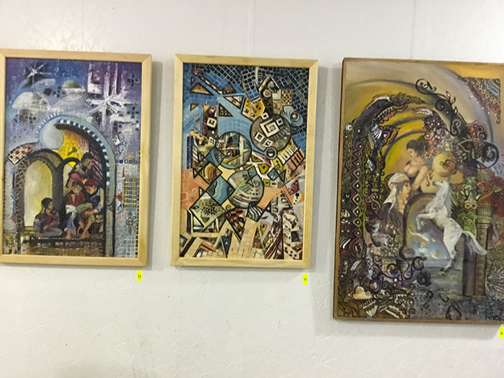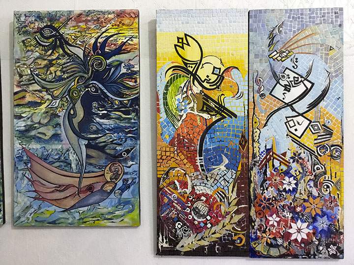 في بهو دار الثقافة ومنذ دخولك تبهرك الألوان القوية والمتعددة، حتى أنّك لا تجد نقطة البداية والانطلاق، فكل اللوحات تشعّ ألوانا بهيجة فاقعة، لتختطفك منذ الوهلة الأولى، من عالم الفتور والدكانة والغبار الى مجال الحيوية والديناميكية، والموجات العالية.