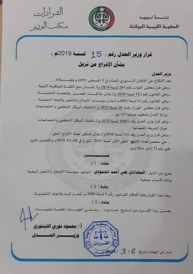 باب نات - أصدر وزير العدل بالحكومة الليبية المؤقتة محمد نوري الفيتوري، يوم الأربعاء، قرارا بالإفراج عن أخر أمين للجنة الشعبية العامة (رئيس وزراء) البغدادي المحمودي من سجنه الهضبة بالعاصمة طرابلس وذلك لأسباب صحية.