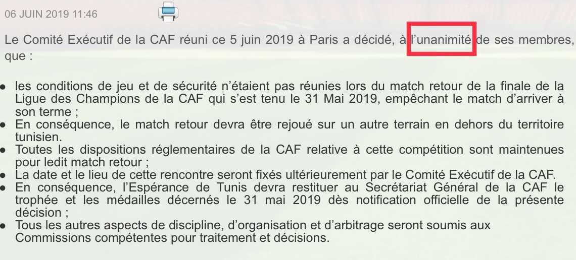 طبعا الترجي كما الجامعة تم القاء المسؤولية عليهما من "الكاف"، ولم يكونا في واقع الامر بمنآى عنها خاصة وأن "غياب شروط اللعبة" و"غياب شروط السلامة" تم اقرارها من المكتب التنفيذي لـ"الكاف"، وليس من أحمد أحمد فقط والقرار لم يتم بالأغلبية فحسب بل بـ"الاجماع" unanimité، وهو ما يعني أن هذا الامر الخطير موثّق من خلال تقارير متعددة ومتطابقة لـ"رسميي المقابلة" officiels du match (اللهم ما هو مدون على قرار "الكاف" مزوّر وهو أمر غير ممكن)، وهي بالاساس تقارير الحكم والحكام المساعدين ومراقب المقابلة ومتفقد الحكام والمنسق العام ورسمي السلامة، التي تسلم لـ"الكاف" في ظرف 48 ساعة التي تلي المباراة.. والا لما حاز الاجماع الحاسم التي تحولت معه فرحة الترجيين الى مرارة قاتلة..