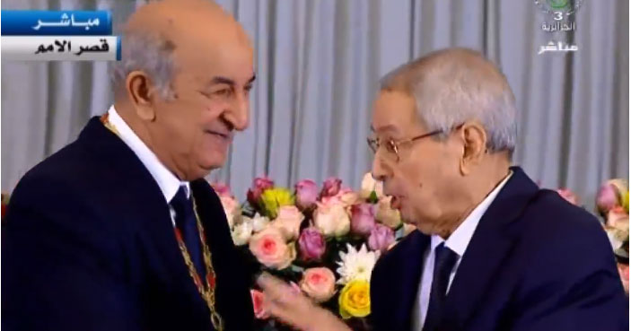 وشهد الحفل تسليم المهام لتبون من الرئيس المؤقت عبد القادر بن صالح الذي تولى المهمة مؤقتا في أبريل/ نيسان الماضي خلفا لعبد العزيز بوتفليقة، الذي أطاحت به انتفاضة شعبية دعمها الجيش بعد 20 عاما في الحكم جعلته أكثر رؤساء البلاد مكوثا في المنصب.