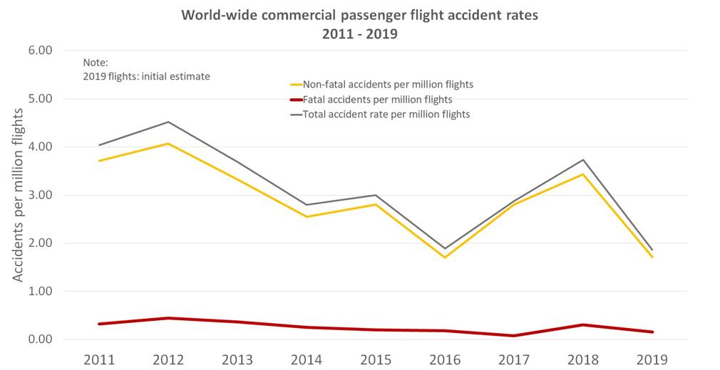 وأشار التقرير إلى أن معدل الحوادث المميتة للطائرات الكبيرة في النقل الجوي التجاري انخفض إلى 0.18 حادث مميت لكل مليون رحلة في عام 2019 من 0.30 حادث لكل مليون رحلة عام 2018.