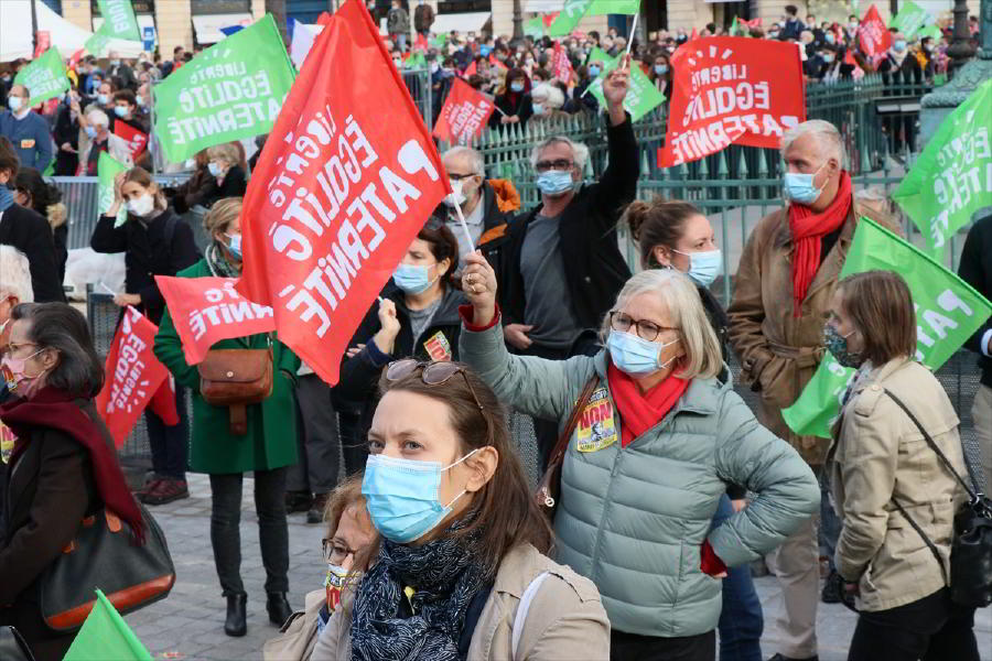 ففي العاصمة باريس، تجمع آلاف المتظاهرين أمام مبنى وزارة العدل بميدان فاندوم، متهمين الرئيس إيمانويل ماكرون وحكومته، بالخضوع لضغوط لوبيات شركات الأدوية و"المثليين".