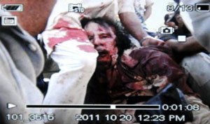 وكالات - بثت وكالة الأنباء الفرنسية صورة لجثة العقيد معمر القذافي بعد تأكيد مقتله من قبل المجلس الانتقالي الليبي متأثرا بجروحه ، وذلك عقب لحظات من إعلان مسؤول آخر بالمجلس اعتقال القذافي والمتحدث باسم قواته موسى إبراهيم.