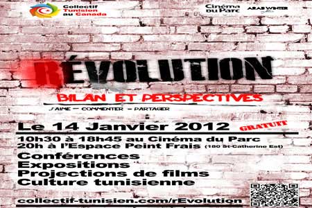 tap - ''rEvolution, Bilan et Perspectives est le thème d'une manifestation culturelle qui sera organisée par le Collectif Tunisien au Canada (organisation à but non lucratif et non partisane), le samedi 14 janvier 2012 à Montréal, en partenariat notamment avec le Consulat de Tunisie à Montréal.