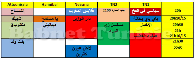 في خضم التخمة التلفزية التي ترافق شهر رمضان , نوافيكم بجدول أهم الأعمال الدرامية التي تعرض على القنوات التلفزية التونسيةالوطنية 1 و2 , حنبعل , نسمة و التونسية.