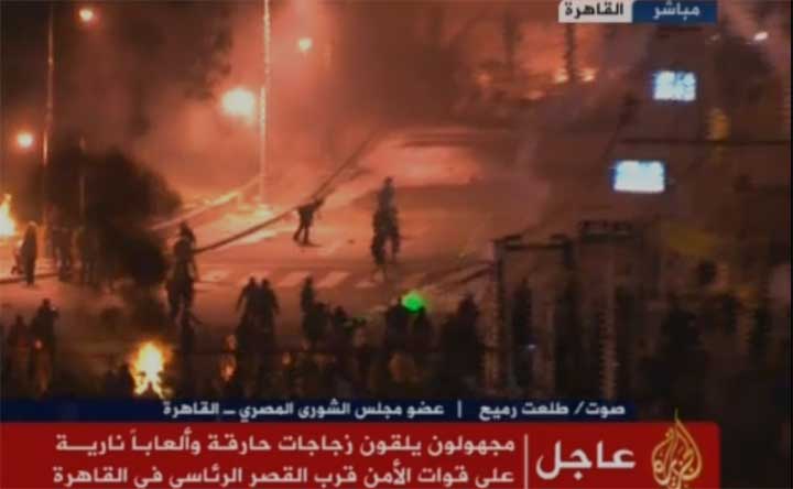وقد القى المحتجون الذين كانوا ينددون بسياسة الرئيس محمد مرسي، المنتمي الى التيار الاسلامي، زجاجات حارقة وحجارة على قوات الامن التي ردت بخراطيم المياه واطلاق النار في الهواء.