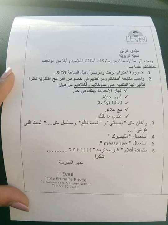 باب نات - أكدت مديرة مدرسة ابتدائية خاصة أنها دعت في مراسلة لأولياء التلاميذ الى منع أبنائهم من متابعة الفايسبوك و”الميسانجر” ومشاهدة عدد من برامج قناة الحوار التونسي على غرار “نهار الأحد ما إهمك في حد” و ” لتسقط الأقنعة” و” عندي منقلك”.