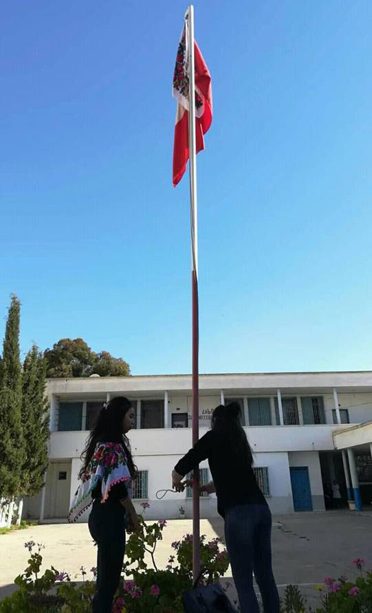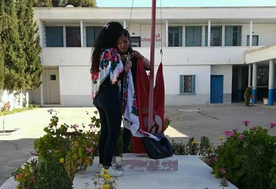 رفع تلاميذ معهد جوهرة بسوسة “فولارة المرأة الكادحة المضطهدة” مع الراية الوطنية أثناء تحيتهم للعلم قبل التحاقهم صباح اليوم بمقاعد الدراسة.