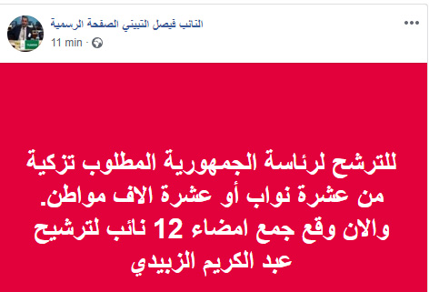 باب نات - طارق عمراني - قال النائب في البرلمان عن حزب صوت الفلاحين فيصل التبيني بأنه يعتبر ان وزير الدفاع عبد الكريم الزبيدي هو رجل المرحلة للترشح للإنتخابات الرئاسية و أنه قام بجمع 12 تزكية من النواب لتمكينه من ذلك، و أضاف التبيني بأن حركته كانت عفوية و دون تنظيم مسبق كما أنه اتصل بالزبيدي لإعلامه ليجيبه "موش وقتو... سيد الرئيس مازال كيف توفّا"