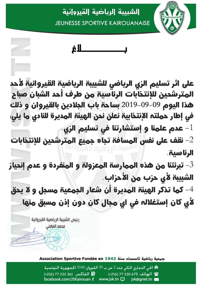 من جانبها أعلنت الهيئة المديرة للشبيبة القيروانية في بلاغ لها عن عدم علمها أو استشارتها في تسليم الزي.