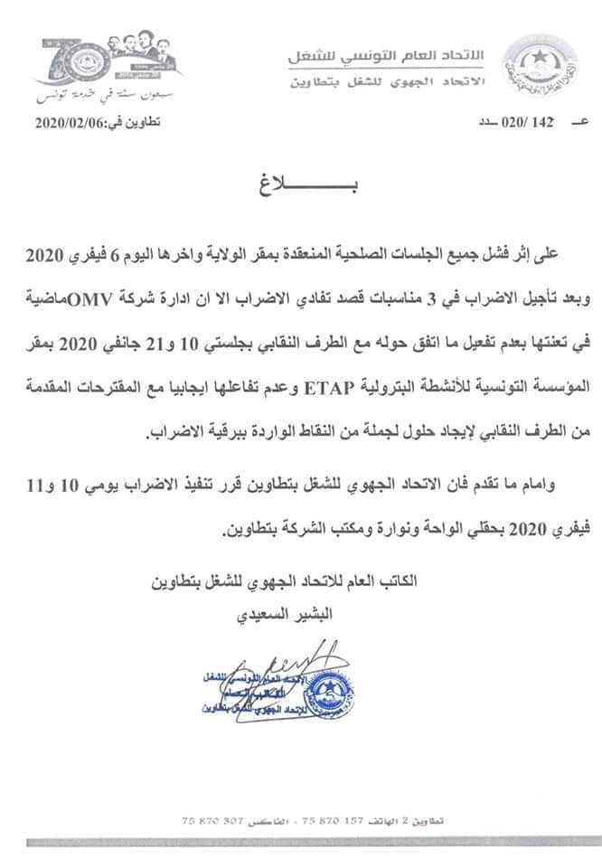 باب نات - قرّر الخميس 6 فيفري، الاتحاد العام التونسي للشغل تنفيذ اضراب عن العمل يومي 10 و11 فيفري الجاري بحقلي الواحة ونوارة وفرع شركة omv بتطاوين.