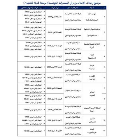 نشرت وزارة النقل السبت 11 أفريل 2020 جدول رحلات جديدة ستنطلق من 11دولة لاجلاء التونسيين العالقين وذلك عملا باتفاق تم أمس بورزاة الشؤون الخارجية ووزراء الشؤون الخارجية والنقل والداخلية والتعليم العالي والبحث العلمي وغيرهم .