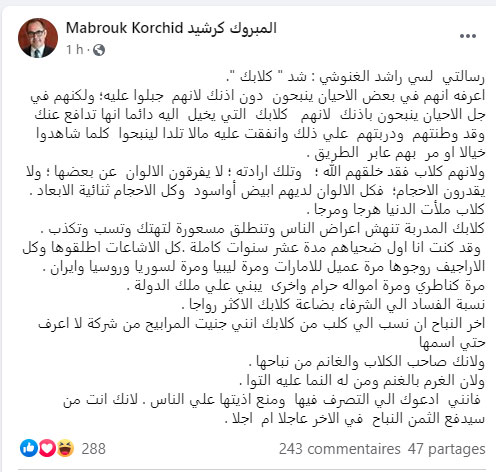 "رسالتي لسي راشد الغنوشي : شد " كلابك ".