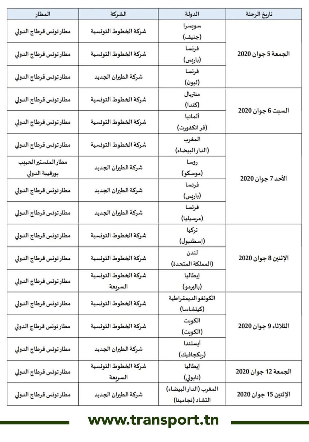 نشرت وزارة النقل مساء يوم الأحد 31 ماي 2020، برنامجا لرحلات عودة التونسيين بداية من 5 جوان 2020 انطلاقا من عدة وجهات وفقا للجدول المصاحب ''الذي يظل قابلا للتحيين'' وفق بلاغ الوزارة.