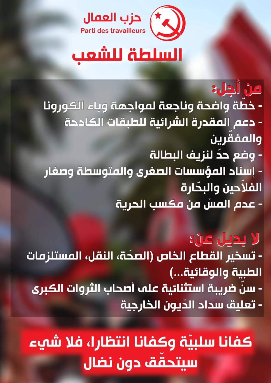 وقد دعا حزب العمال وفق بلاغ تلقينا نسخة منه كل الفئات المتضررة إلى تنظيم صفوفها وتوحيد جهودها في تيار واحد من أجل وضع حدّ لانهيار البلاد على يد حكم السماسرة والمافيات.