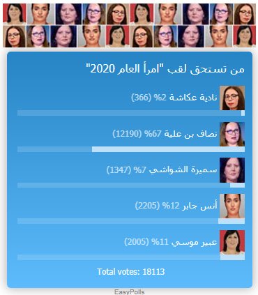 باب نات - اختار زوار موقع Babnet الدكتورة نصاف بن علية شخصية العام لسنة 2020 بنسبة 67% و حصولها على 11700 صوت من إجمالي 18000 شخص صوتوا على الموقع الى حدود يوم 23 ديسمبر .