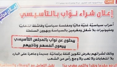 . "أحزاب سياسية غنية ماليا ومفلسة سياسيا وفاشلة انتخابيا ومليونيرات بلا شغل ومغرمين بالسياسية ويهوون السلطة، يبحثون عن نواب بالمجلس التأسيسي يبيعون أنفسهم وناخبيهم وذلك لشرائهم بغرض تكوين كتلة برلمانية جديدة وجاهزة على البارد بلا انتخابات ولا تعب ولا وجع رأس من الشعب. الدفع مقدما ونقدا والثمن مغري جدا ...نقبل التعامل مع الوسطاء والسماسرة".