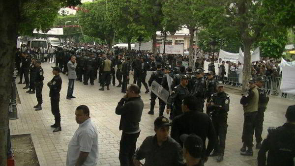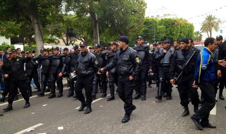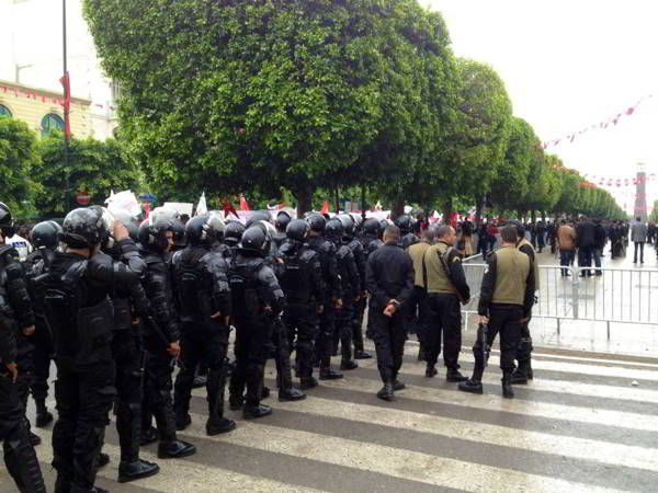 باب نات - انتشر اليوم الاربعاء 1 ماي عدد كبير من قوات الأمن في شارع الحبيب بورقيبة و الشوارع المحاذية لضمان حسن سير الإحتفالات بعيد العمال العالمي و حماية المشاركين فيها .